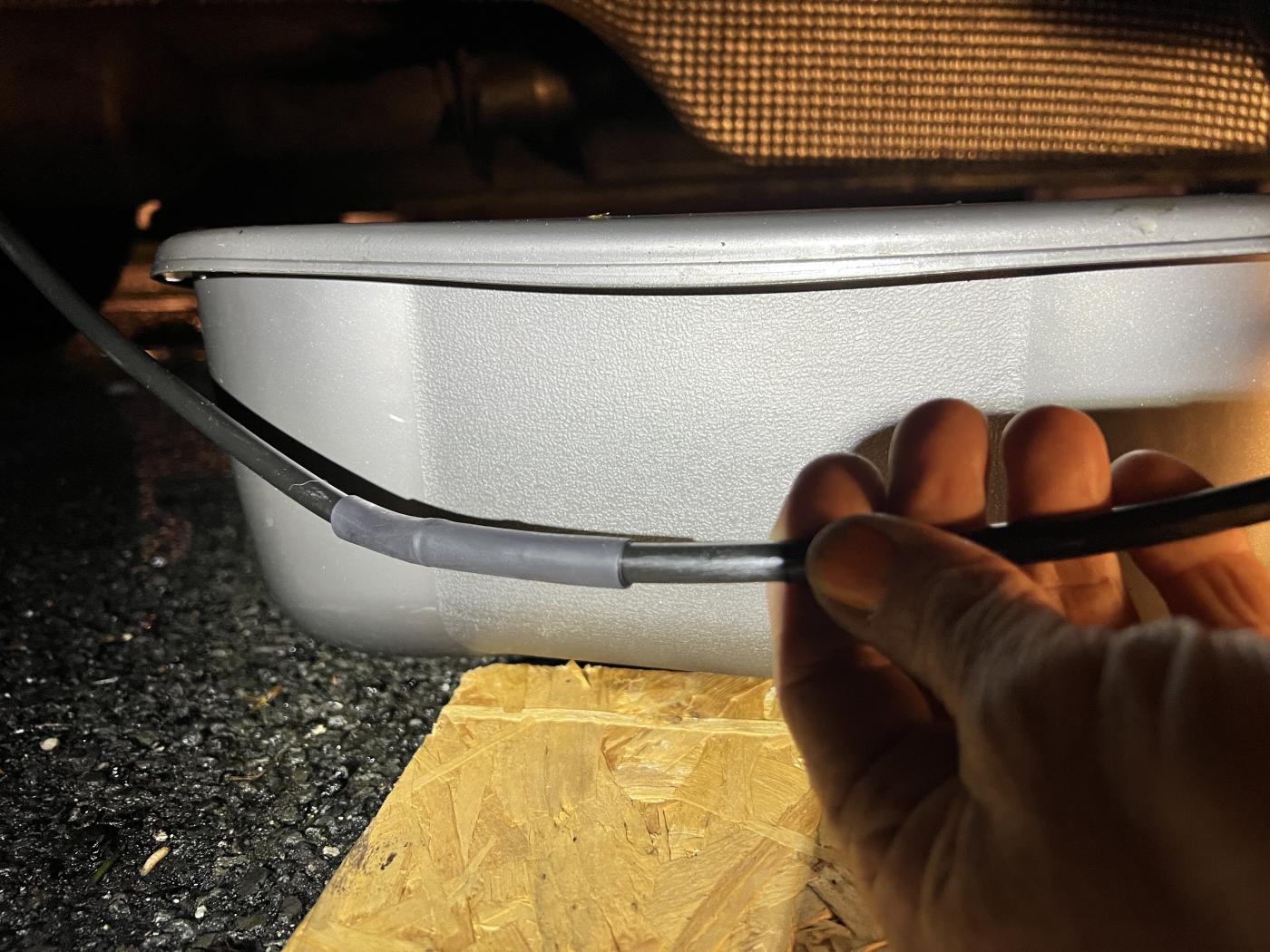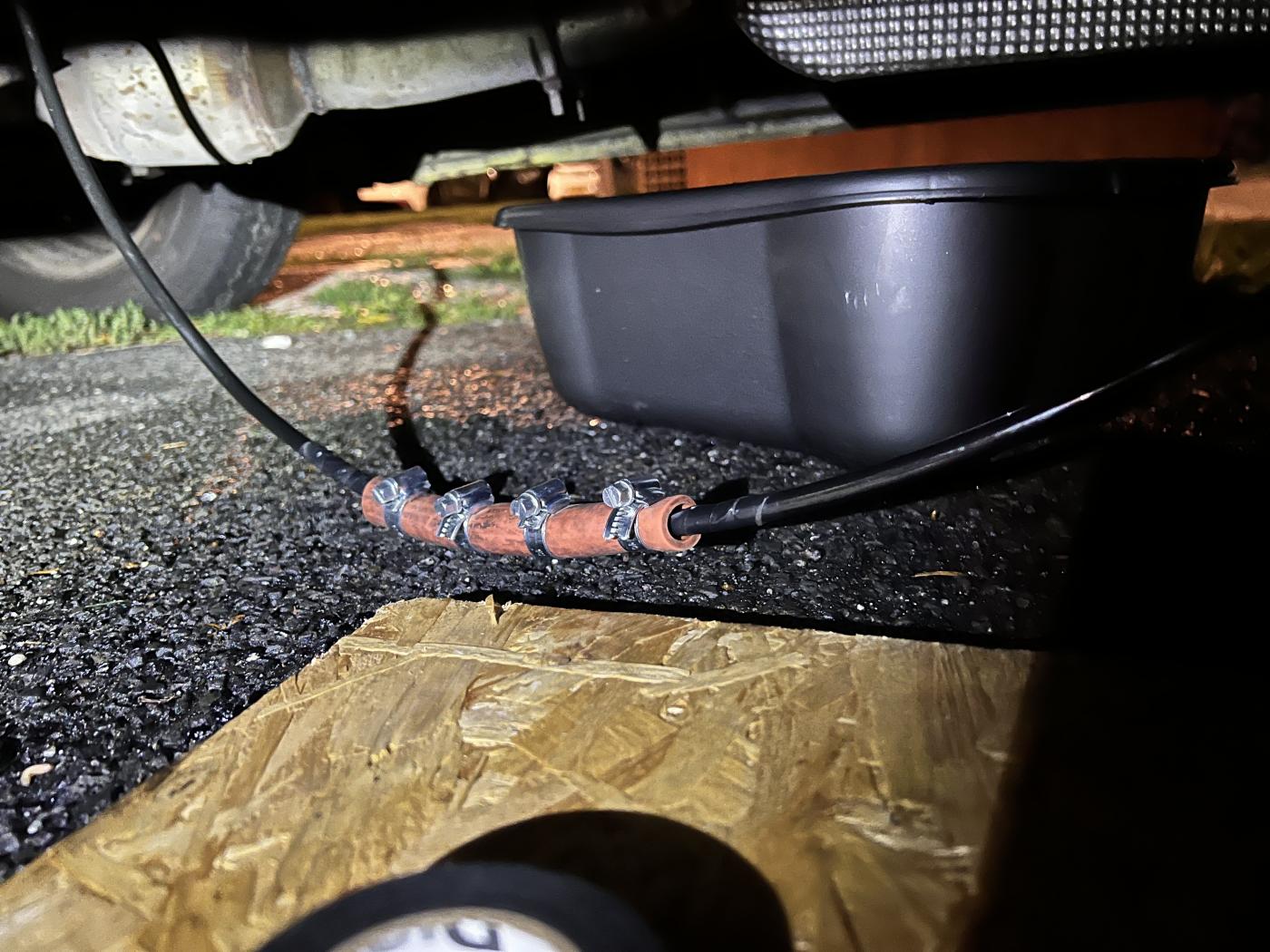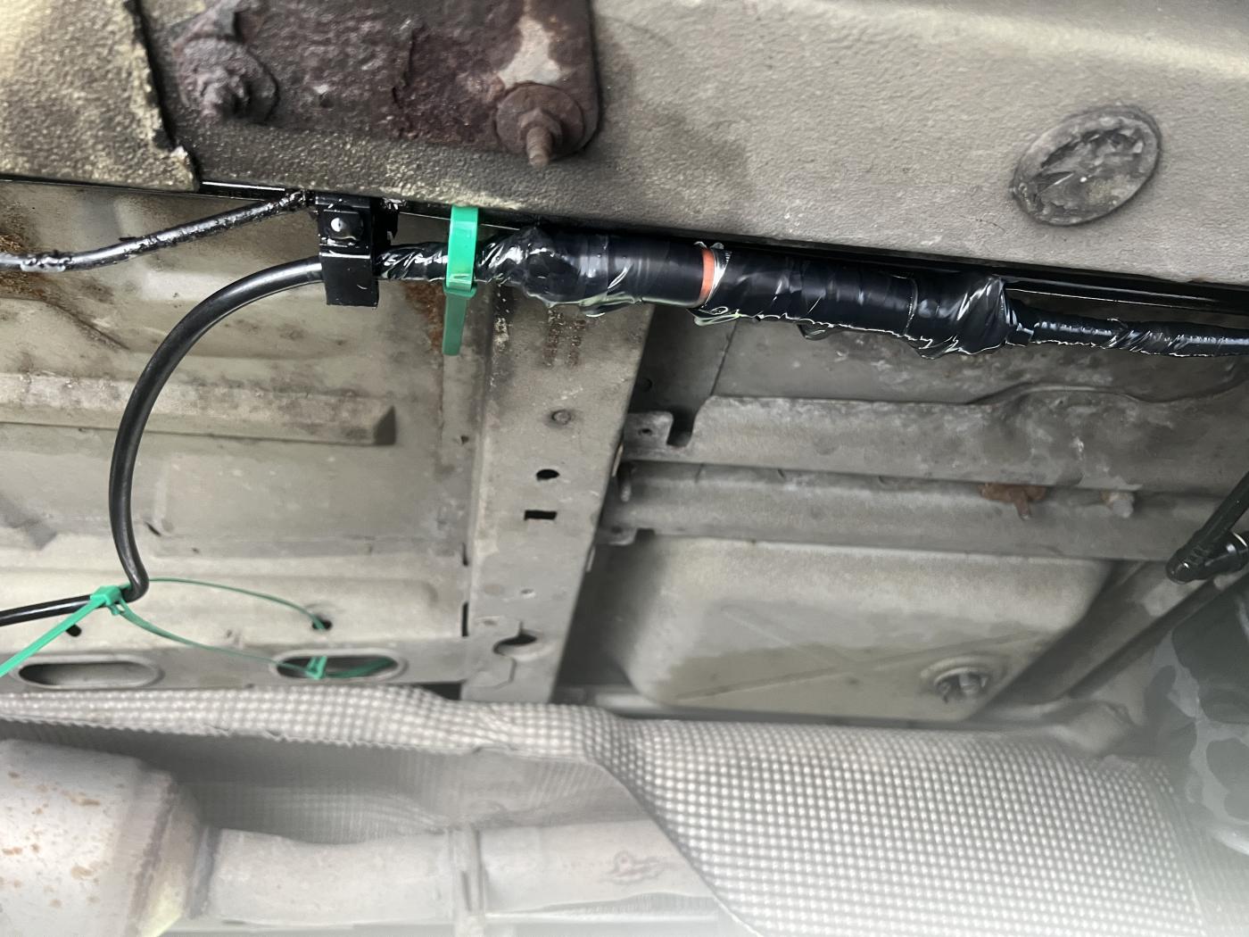 I have temporarily bypassed the mashed up cooler and connected the 2 fuel lines together and seal with hosing and jubilee clips, cable tying onto the underneath floor beams.